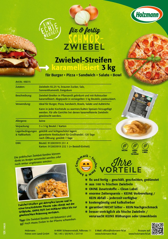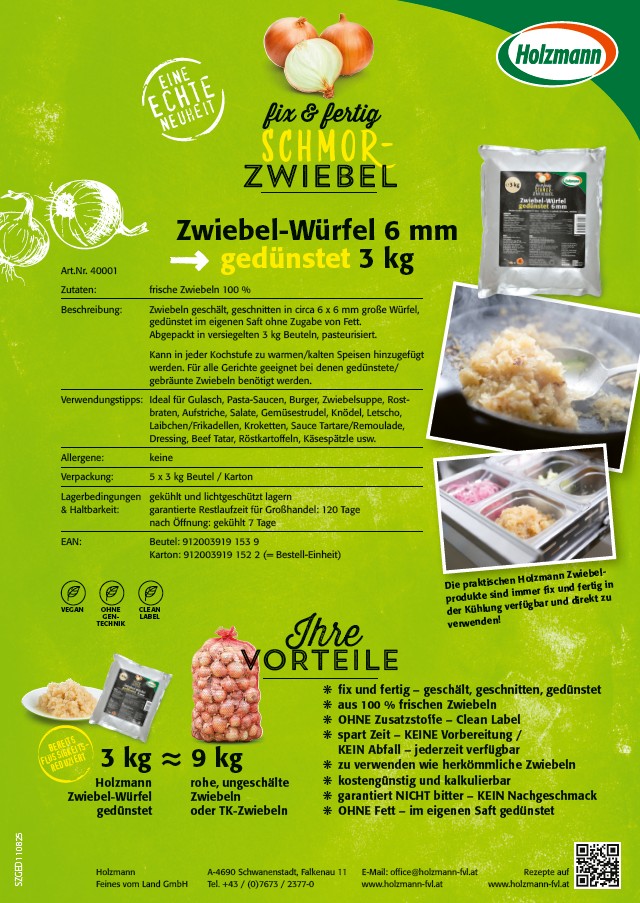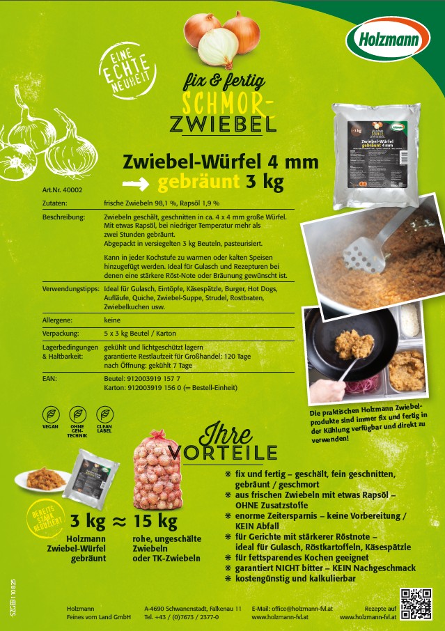 Für unsere Holzmann fix und fertig Schmor-Zwiebeln werden ausschließlich Zwiebeln mit einem besonders hohen Zuckergehalt verarbeitet. Ein spezielles 3D-Schneideverfahren verhindert ein Quetschen der Zwiebeln und ermöglicht die Produktion feinster, exakt geschnittener Zwiebelstücke ganz ohne Bitterstoffe. Durch eine rasche Weiterverarbeitung werden Oxidationen und enzymatische Veränderungen ausgeschlossen. So können wir feinste, süße Zwiebeln garantieren – das ganze Jahr über!
